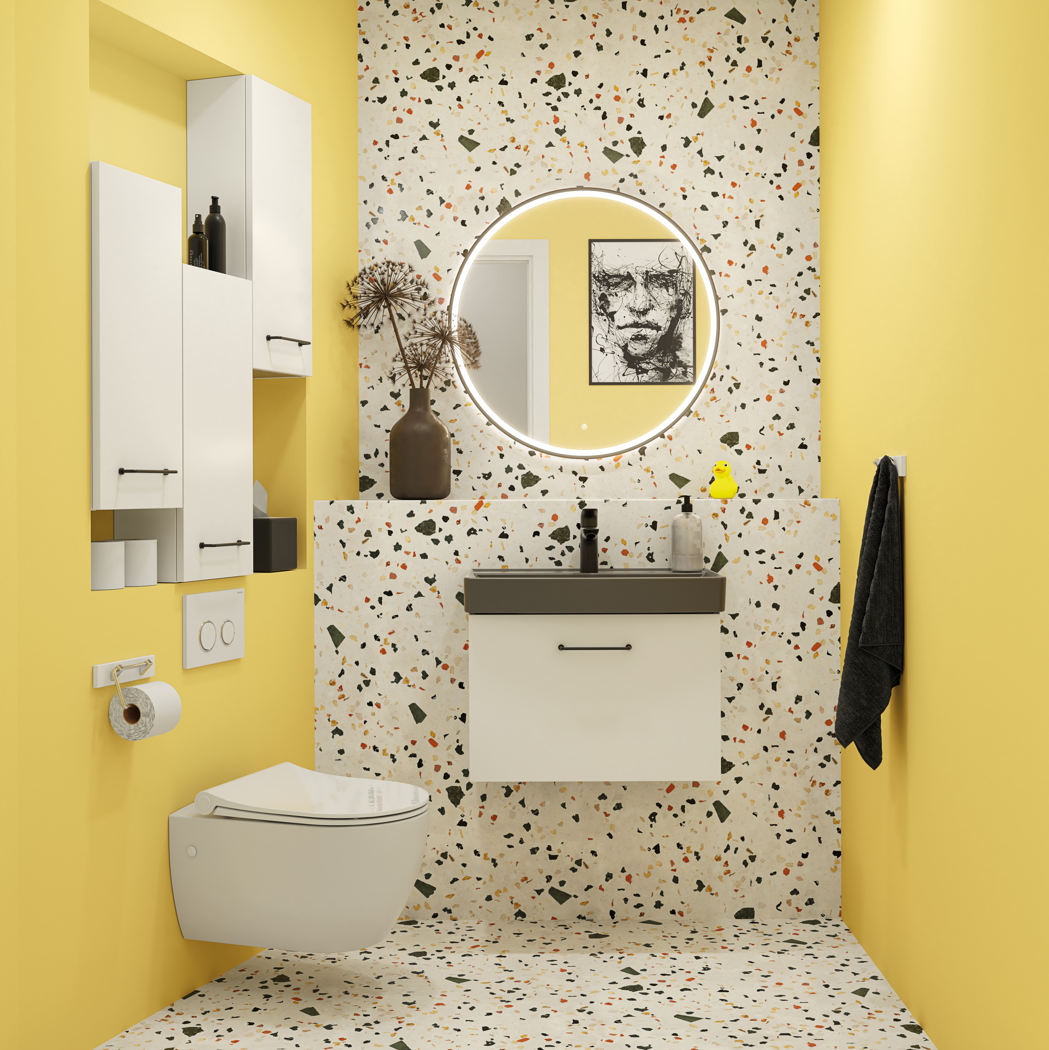 Eller mindre bad eller gjestetoalett med smart oppbevaringsplass?